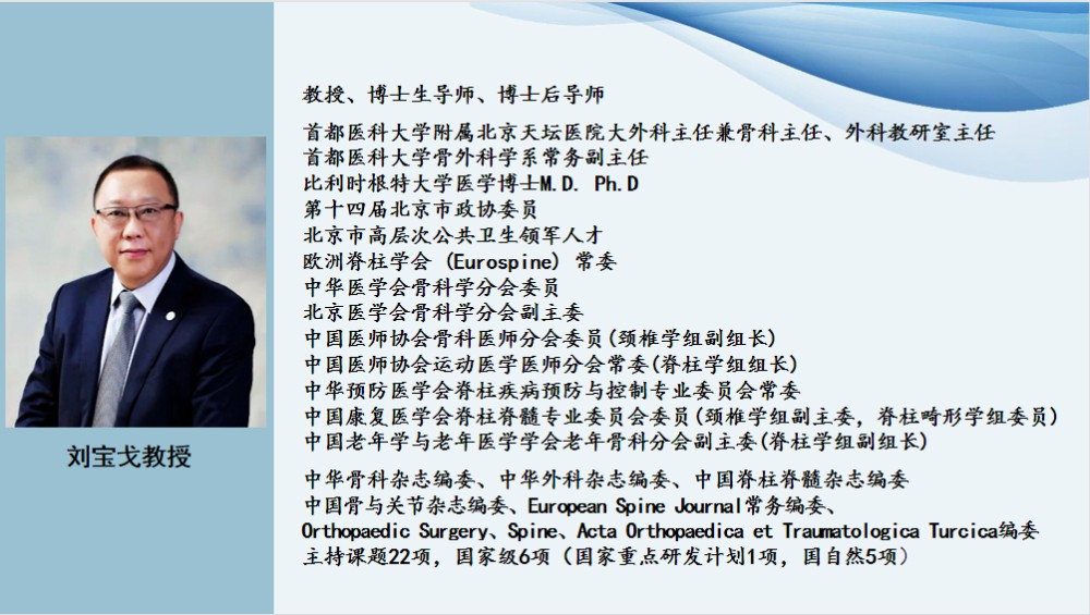 刘宝戈,主任医师,教授,博士生导师、博士后导师。比利时根特大学医学博士M.D,Ph.D。现任首都医科大学附属北京天坛医院骨科主任、大外科主任、学科带头人,中华医学会骨科学分会委员(脊柱外科学组委员)、北京医学会骨科学分会副主委,中国医师协会骨科医师分会委员(颈椎学组副组长)。刘宝戈教授的加盟有利于我院医师了解最新学术动态,开阔视野,启发思路,不断夯实前沿科学基础知识,促进诊疗水平提高,为患者提供更好医疗服务。