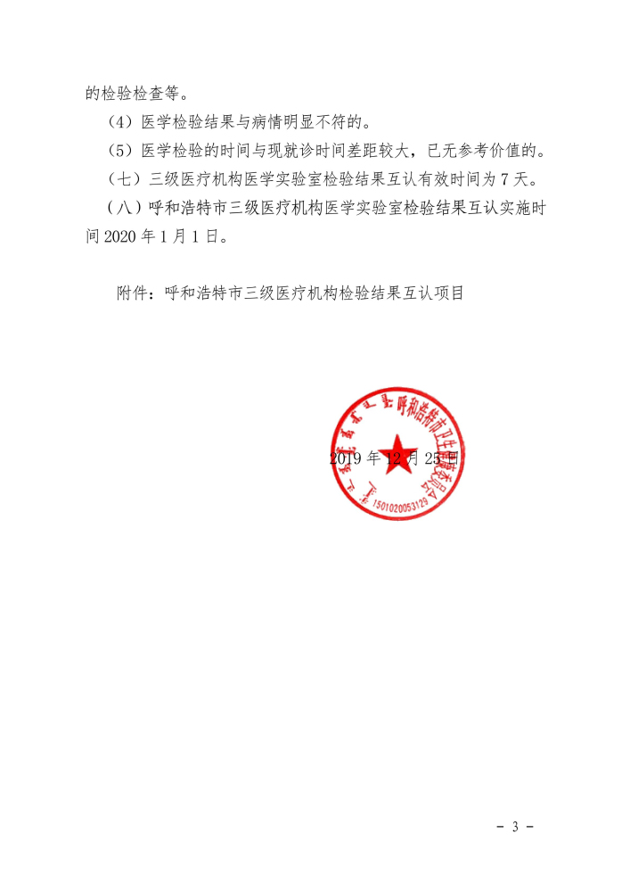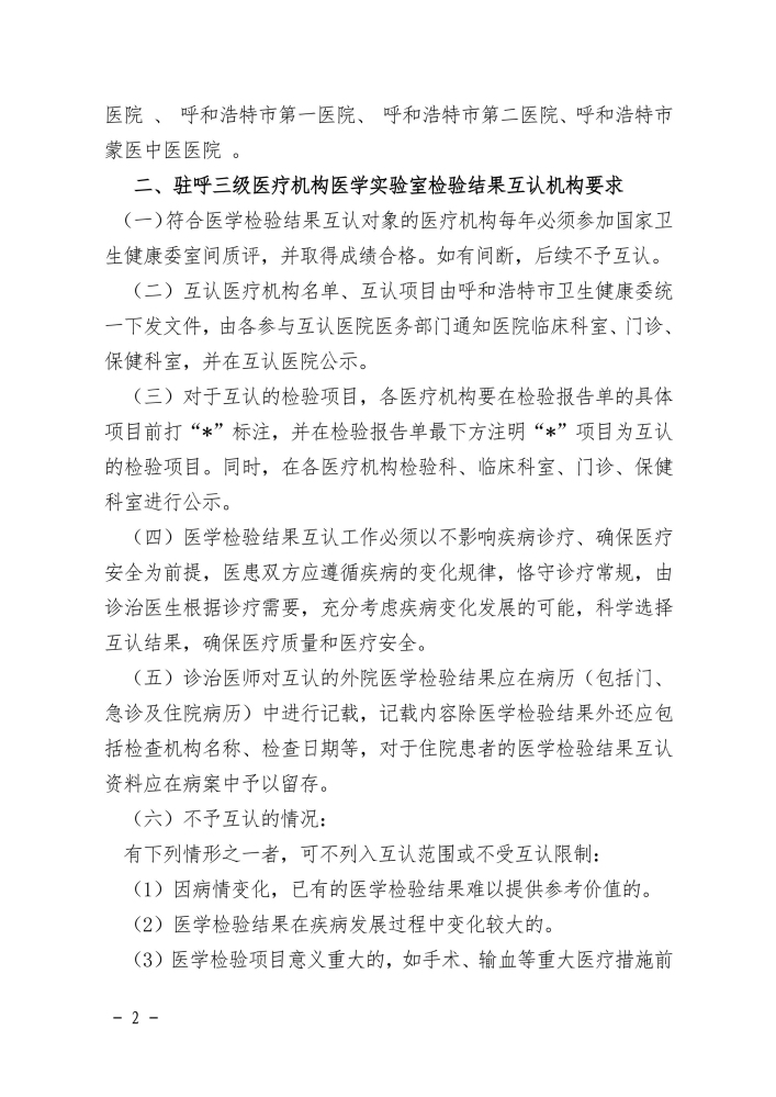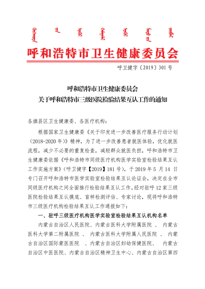 呼和浩特市卫生健康委员会 关于呼和浩特市三级医院检验结果互认工作的通知