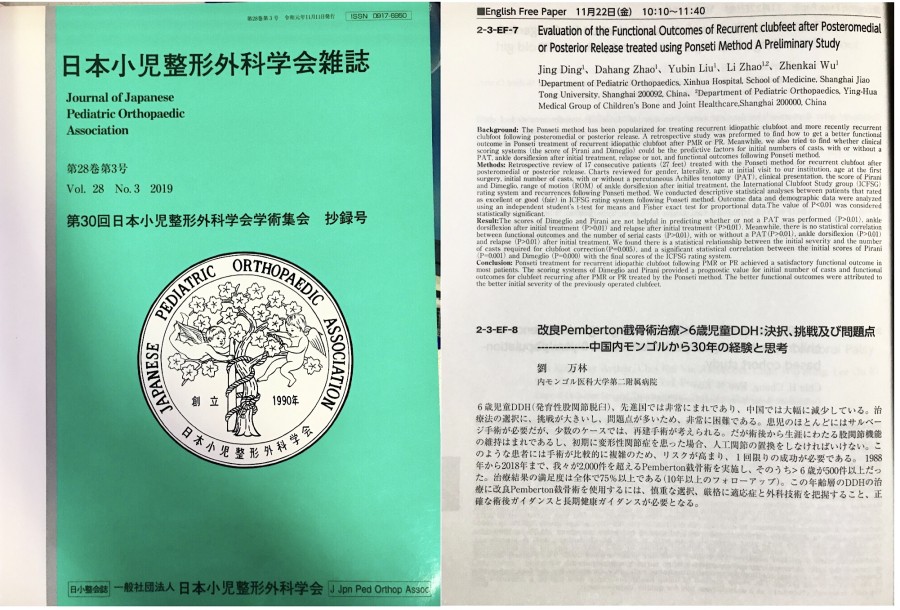本次刘万林教授大会发言的内容,也以会议论文的形式被收录到《第30回日本小儿骨科学术会议论文集》及日本小儿骨科学会官方杂志中。