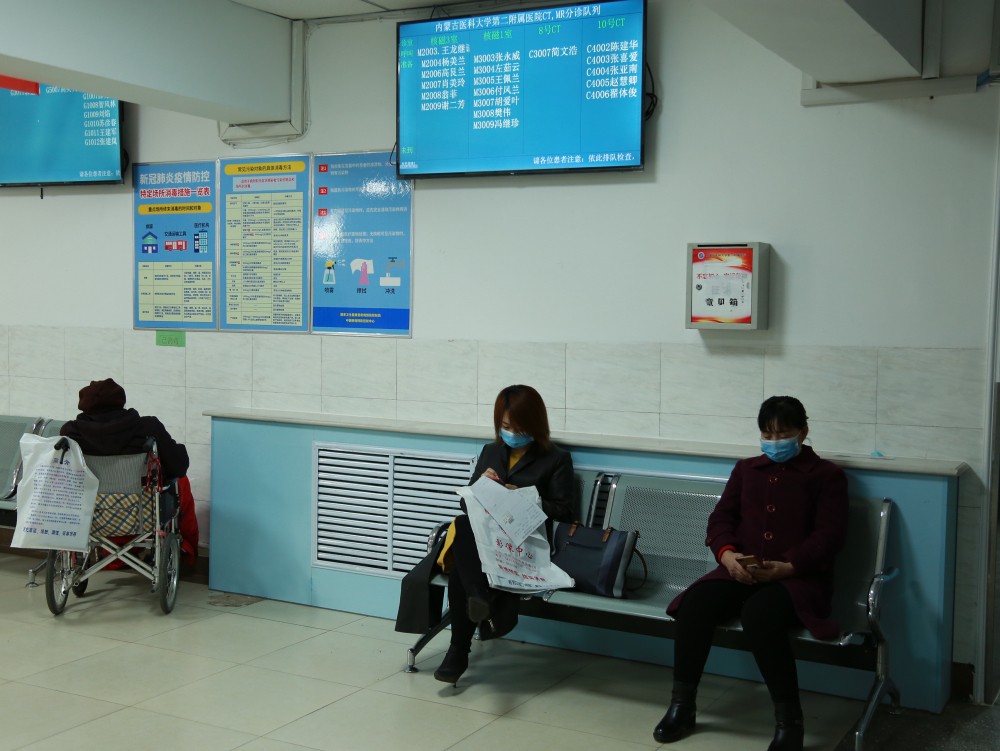 在放射科,等待检查的患者有条不紊的排队等候,确保人与人之间隔1米以上距离,以避免交叉感染。