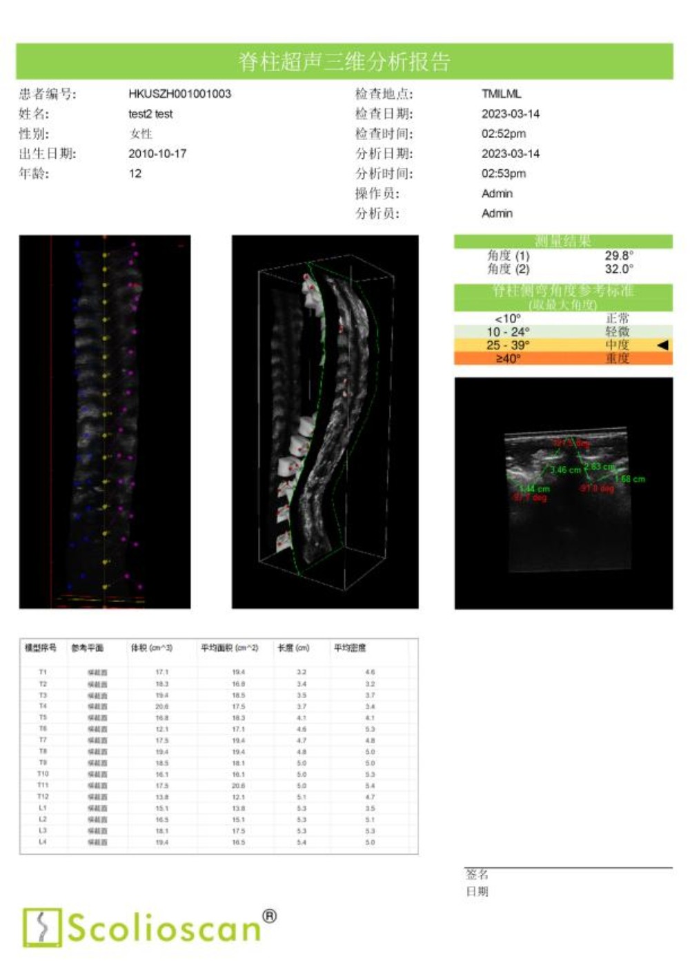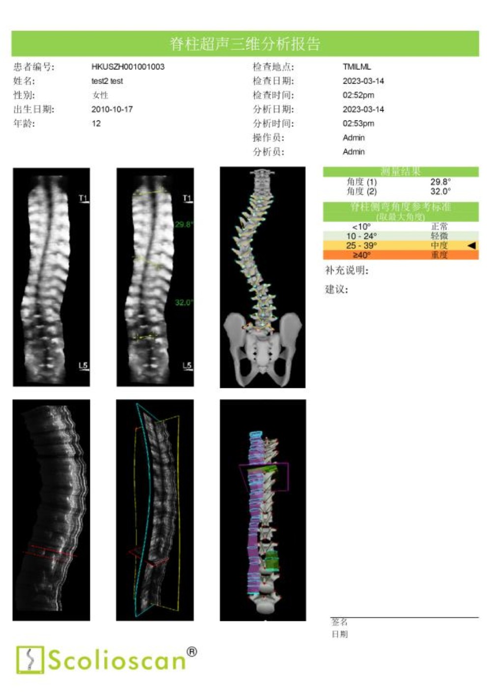 通过动态监测侧弯治疗情况,医生能有效帮助孩子选择适合的运动与锻炼方法。密切的超声监测有助于医生在疾病治疗的黄金期积极追踪病情和评估、调整治疗方案,根据脊柱的最新状况,第一时间采用体育运动、手法治疗、支具佩戴等保守疗法为患者矫正,有效减小脊柱侧弯度数。Scolioscan®提供的肌骨三维分析还可以协助医生以关节—肌肉—神经三维度为整体,全面进行脊柱侧弯的综合康复治疗。