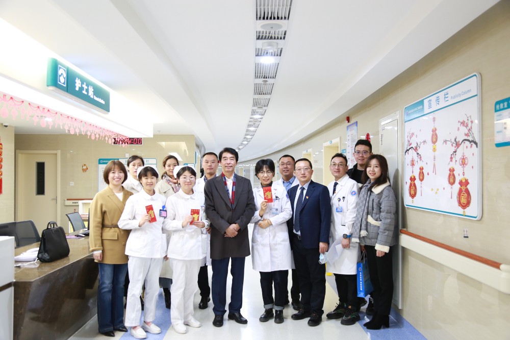 今年春节是医院搬迁后的第一个春节,装扮一新的科室处处洋溢着喜庆的节日气氛。“过年好,大家辛苦了!”每到一处,院领导都与在岗职工亲切交流,转达了对大家的节日祝福,对他们“舍小家、为大家”的奉献精神表示衷心的感谢,并送上了慰问金。