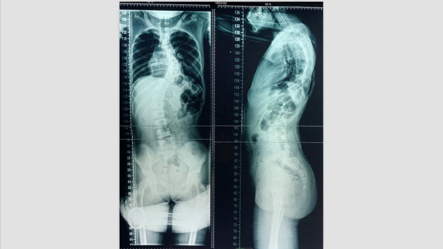 2018年01月患者入院术前X线片:胸部Cobb角71°,腰部Cobb角64°