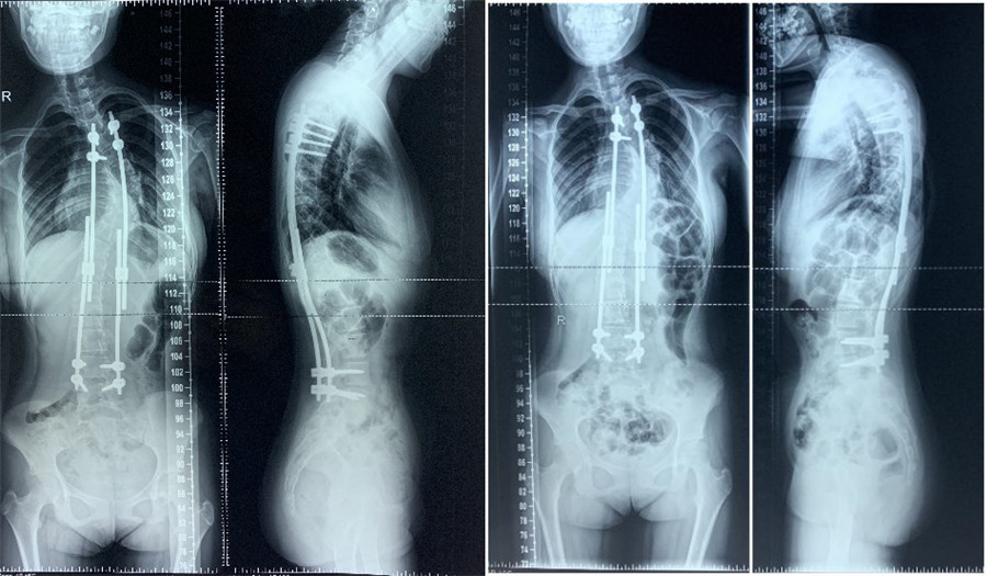 2020年04月彻底根治矫形术胸部Cobb角50°,腰部Cobb角30°站高154cm,坐高122cm