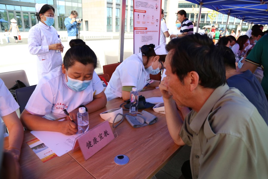 得知医院开展义诊活动,附近的群众陆陆续续地在义诊台前排起长队。义诊工作人员热情地招呼就诊的群众前来进行病情登记,专家们则根据病情进行有序诊治。