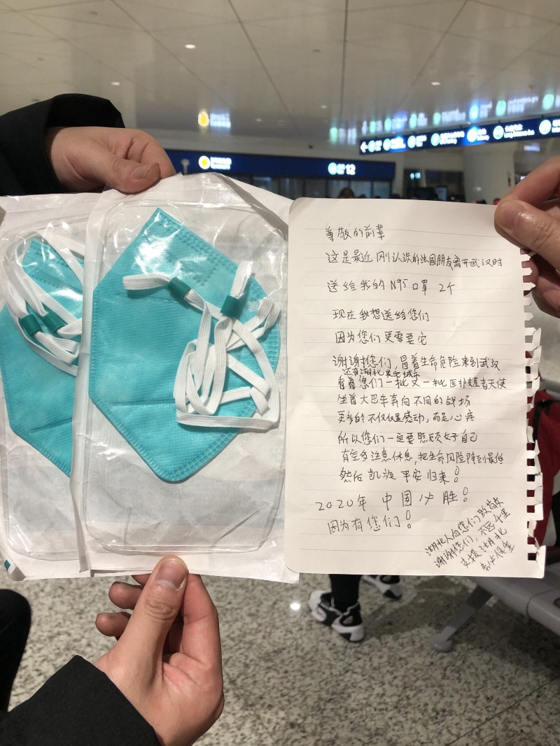 在机场等待车辆的间隙,一位武汉的市民送来了两个口罩,打开袋子一看,他还写了一封简短的信,都说武汉是四大火炉之一,一点不错,武汉人的热情更似火!我们共同努力,我们一定赢!