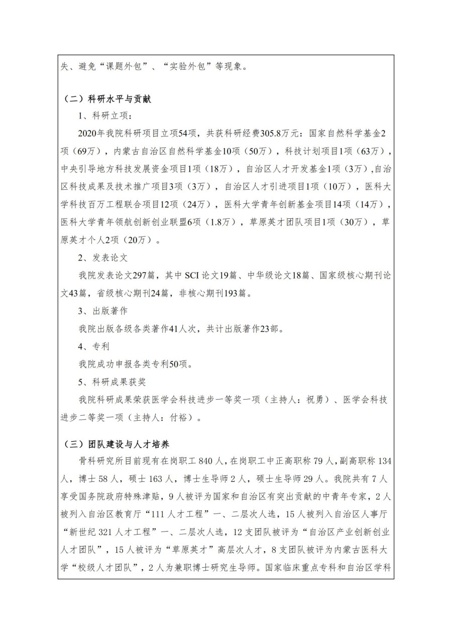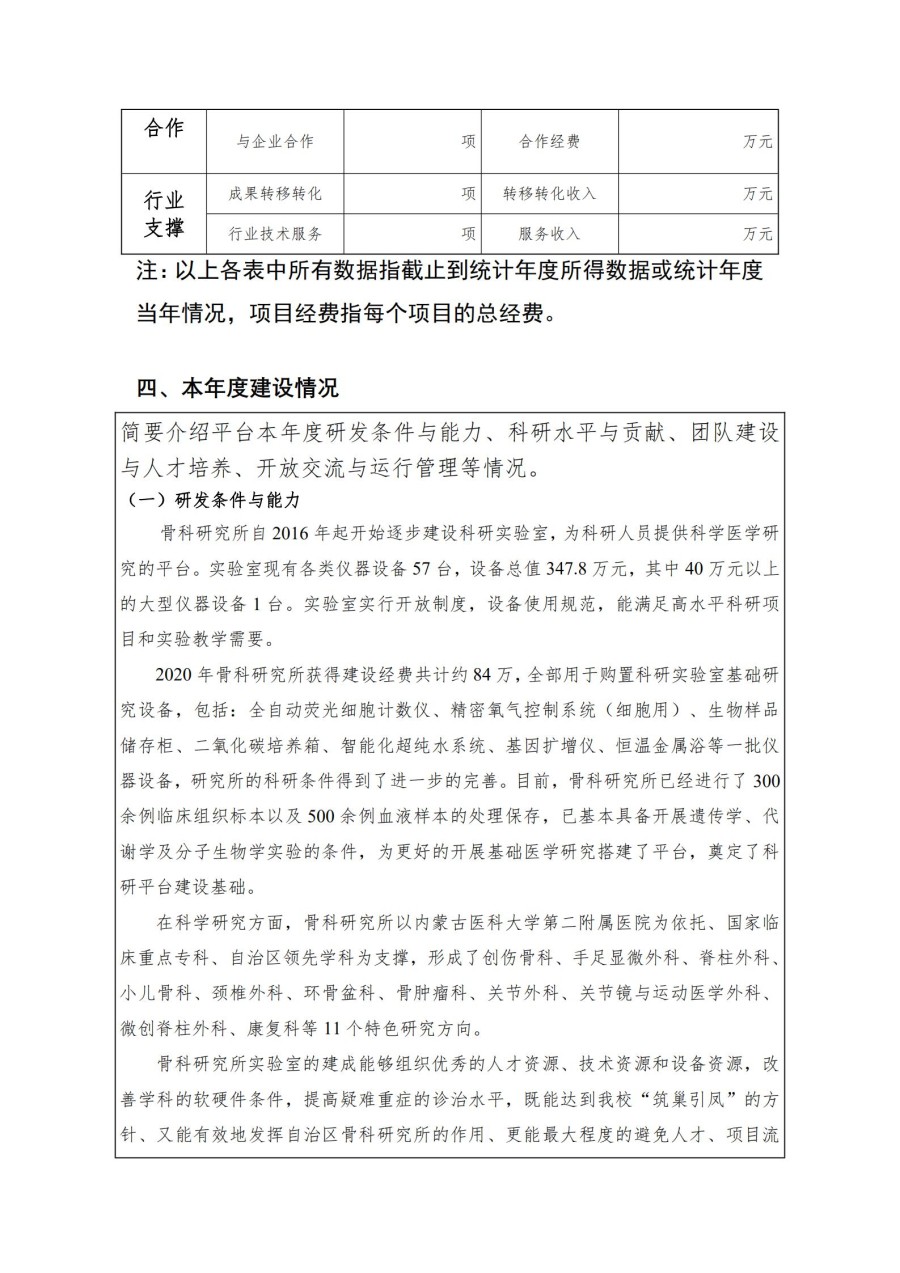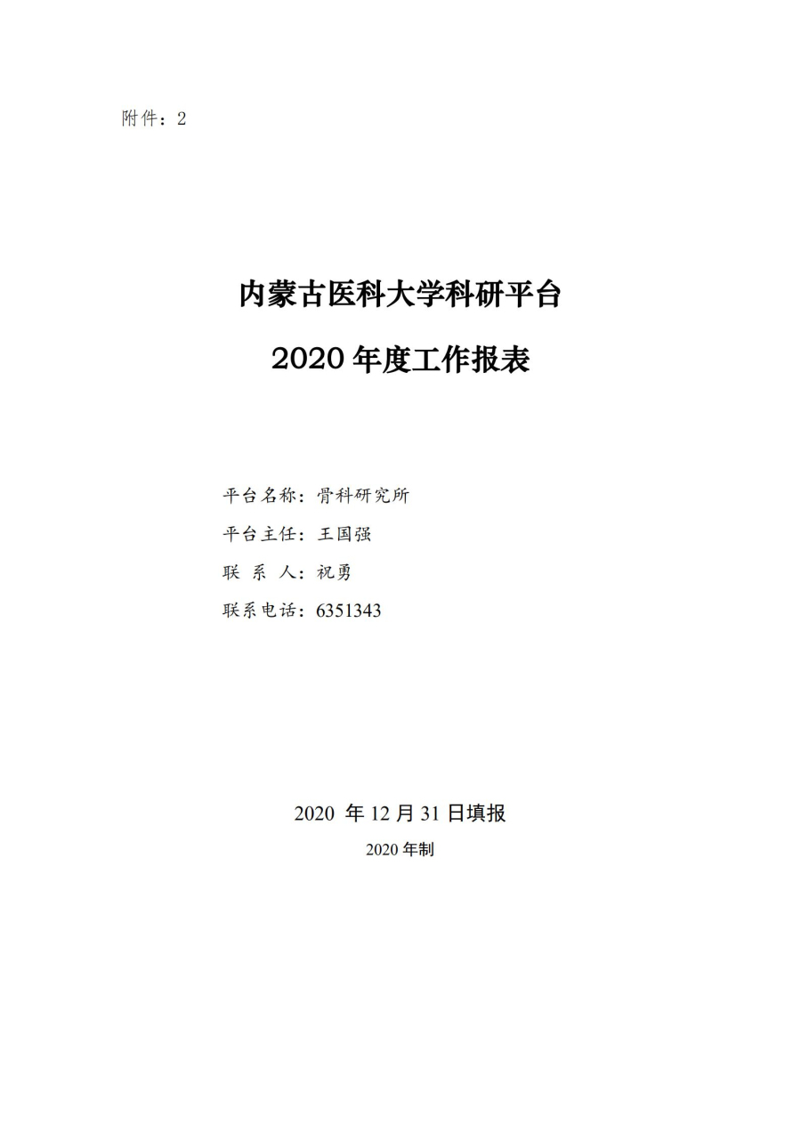 按照内蒙古医科大学《关于开展2020年度内蒙古医科大学科研平台年报填报工作》的通知及相关规定,骨科研究所完成了2020年度年报的填报工作,现将内容公示。自公示之日起三日(1月7日至1月9日)内如有异议,以书面或电话形式向科研科反映,过期不再受理。